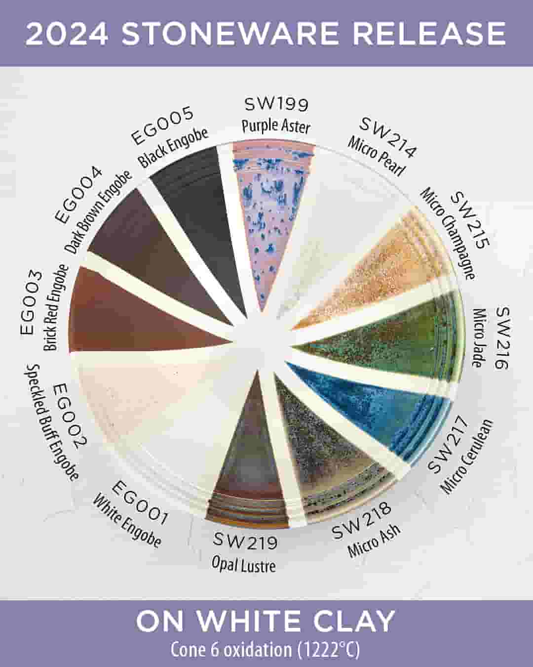 Engobes are used to coat your clay body to your preferred finish/color and are a great base to achieve variability in your glaze results. Chips shown are fired flat on a white clay body fired to cone 6 oxidation and cone 10 reduction. The choice of clay body, the thickness of glaze application, the firing process, and temperature will affect the fired results.