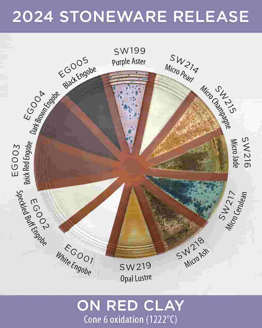 Engobes are used to coat your clay body to your preferred finish/color and are a great base to achieve variability in your glaze results. Chips shown are fired flat on a white clay body fired to cone 6 oxidation and cone 10 reduction. The choice of clay body, the thickness of glaze application, the firing process, and temperature will affect the fired results.